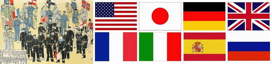 | 八國聯軍:美、日、德、英、法、奧、意、俄、澳、印等國軍隊,下面說說日本旗, | |||||||||