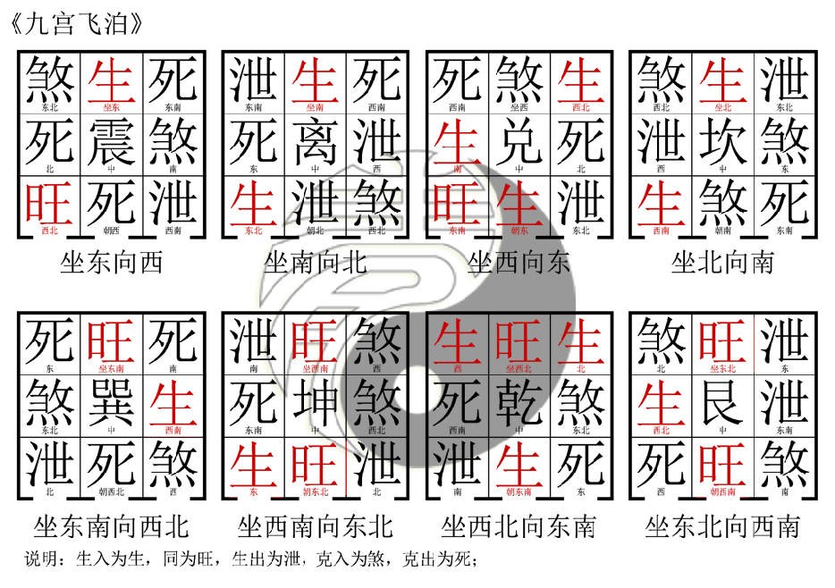 | 九宮飛泊,文王八卦,飛的方向與飛星相同,知識點來源是二元八運,與飛星的區別是九星以大方向為基礎,針對宅地,飛泊以宅基為主,針對大方向,看似一樣東西,實際上是兩樣不同的知識,并沒有誰對誰錯之分; | |||||||||