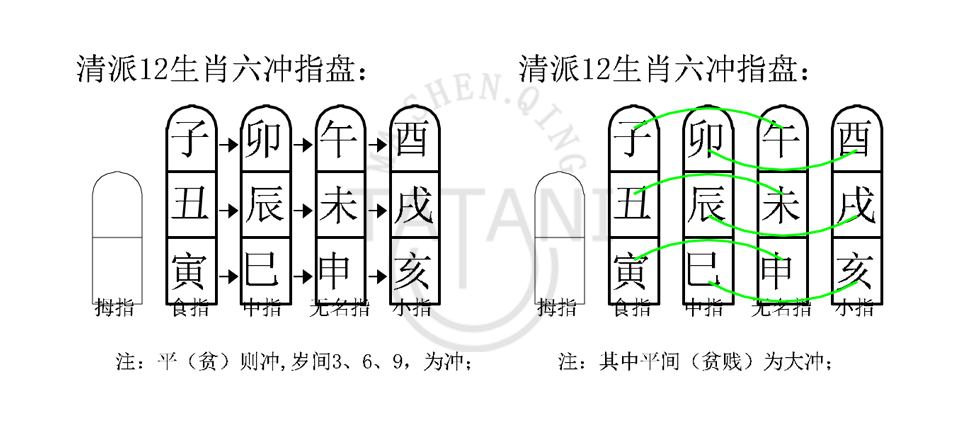 | ·清派生肖盤三合、三煞信息;方向東南西北逆數,結合口訣:“三合東當頭,三煞北當先;”說的是拇指,但算的不是拇子,這樣做也是為了迷惑別的門派; 例如:子辰申三合桃花位在‘正西’,三煞位則在‘正南’; |