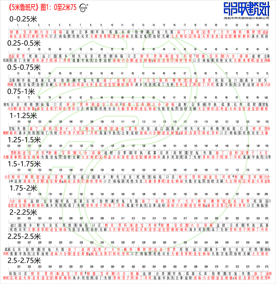 ·魯班尺,又公文和丁蘭兩尺組成,公文尺用于陽宅,丁蘭尺用于陰宅;用于長度、寬度;市面上,紅的為吉,黑的為兇,求什么對照相應的字;注:古代長度為46.08(但古代每個朝代尺的長度都有差別,)現在市面上的魯班尺,以公文尺(陽尺)分別有42.9和50.4厘米,本人習慣用的是42.9,50.4的有用過,但效果是相反的,但到底那個準,或者不準,因為人的命運非風水一樣東西決定,風水的影響也非只看某一方面,所以魯班尺占的比例少,這方面核心的知識,又沒有得到師父傳授,個人一直沒辦法考證,如果某天,我把風水尺的核心知識找到,并算出新尺,相信也未必有人會用,所以暫時我只是買把市面上已經算好(或瞎編的)的用算了,哪天找到了核心知識及驗證方法,一定第一時間分享給大家;現在我用的是市場上流通的并非老式風水尺;也有臺灣產,香港產的,也是兩者的結合體,公文尺的長度429mm,丁蘭尺的長度390mm,然后不斷組合在一起,里面的內容豐富了很多,用法,求什么就要用在那個位置上;紅色為吉,黑色為兇;