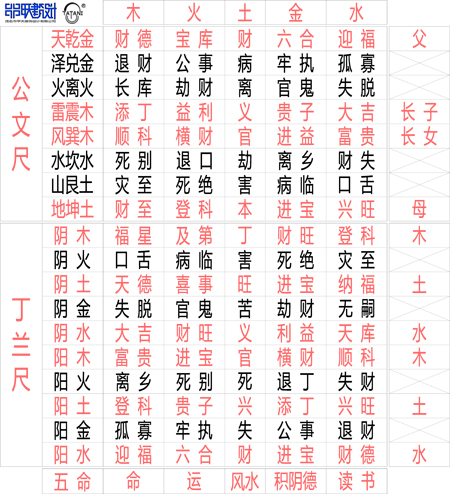 ·魯班尺----又名‘門尺’、‘風水尺’,由天子國公孫文的《公文尺》和魯國班匠《丁蘭尺》兩尺合成; 公文尺記憶方法: 一、按(先天八卦)身份地位:古代重父、母和長子長女,平分八份,其它都是不好的! 二、結合上面,先天加五行(木火土金水); 1、天為乾金(陽):(陽出)1木出金為財德,2火出金為寶庫,3土出金為財,4金出金為六合,5水出金為迎福; 2、澤為兌金(陰):(陰入)1木入金為退財,2火入金為公事,3土入金為病,4金入金為牢執,5水入金為孤寡; 3、火為離火:1木火為柴,柴進(長庫),2火加火為劫(柴)財,3土掩火為離,4火遇金為官鬼,5水到火失脫; 4、雷為震木:1雷為木生,木生木(添丁),2火因雷木而生(益利),3土與木為(義),4木得金生(貴子),5木得水(大吉); 5、風為巽木:1風+木順科,2木+火益風(橫財),3風木得土為(官),4風木得金為(進益),5風木得水為(富貴); 6、水為坎水:水沖木為死別,火燒水為(退口),土掩水為(劫),金遇水(離鄉),水沖塘則(財失) 7、山為艮土:1木克土(災至),2山出火則(死絕),3山出土為(害),4山出金人挖(病臨),5山出水(口舌) 8:地為坤土:1地出木為財至,2地起火為登科,3地出土為本,4地出金為進寶,5地出水為興旺! 丁蘭尺:記憶方法(陰五行+陽五行生克):把十分陰陽兩個五行,木火土金水+木火土金水; (木、土、水(現)為吉,火、金(藏)為兇;同時參考五行五命:1命(木)2運(火)3風水(土)4積陰德(金)5讀書(知識和水))! 1、丁(木):1陰木為木的(福星),2火可以讓木升華(及第),3木得土添(丁),4木箱裝金(財旺),5木得水(登科) 2、害(火):1木火害而響(口舌),2火遇火害柴分(病臨),3土遇火害,得土為(害),4金遇火害為(死絕),水遇火害為(災至) 3、旺(土):1木植土為天德,2火生土為(喜事),3土加土(旺),4金加土為(進寶),5土添水為(衲福); 4、苦(金):